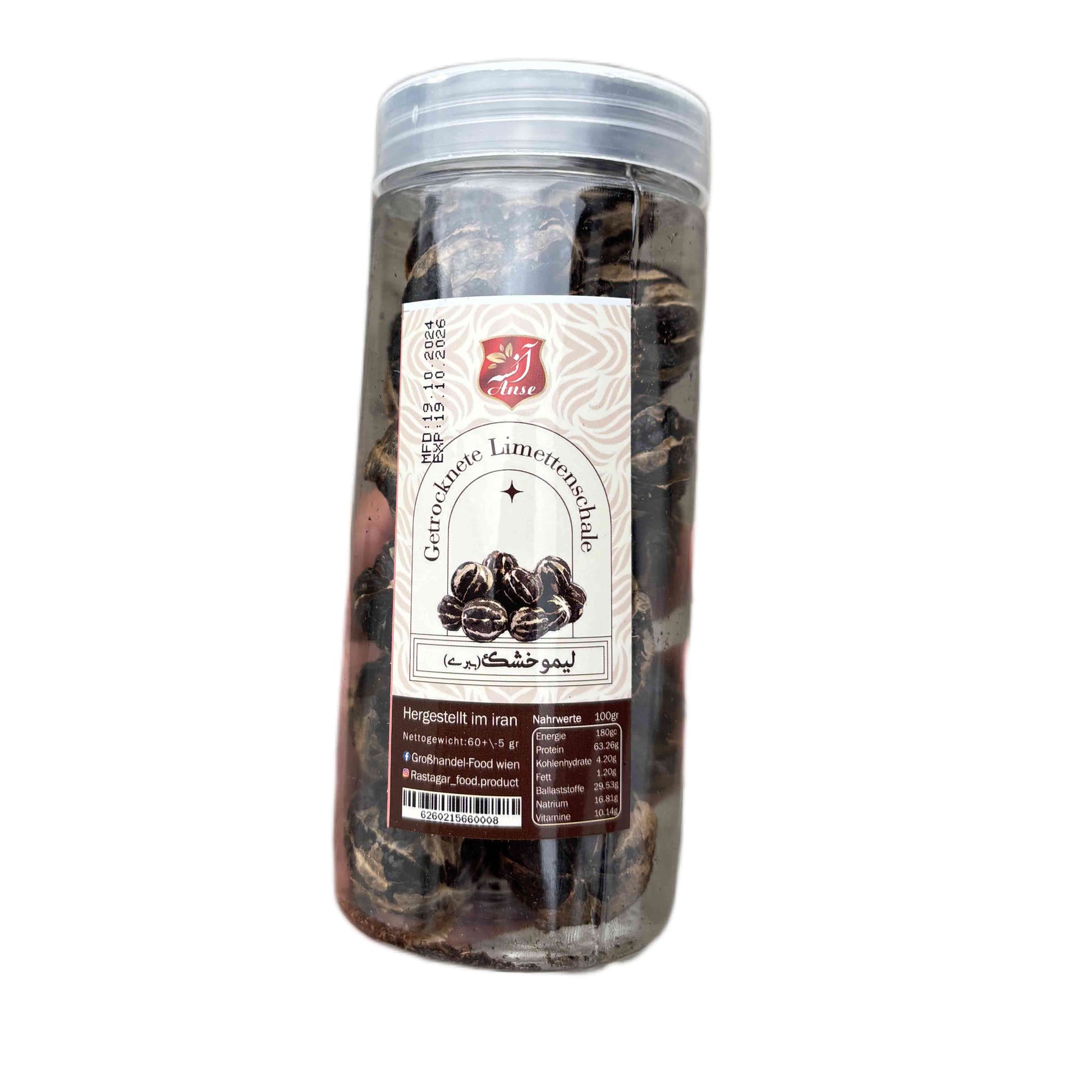 Diese geschälten, sonnengetrockneten Limetten – im Persischen auch als „Limoo Babari“ bekannt – stammen aus den südlichen Regionen des Irans, wo sie traditionell in der Sonne getrocknet und von ihrer harten Schale befreit werden. Ihr intensives, fruchtig-säuerliches Aroma ist ein fester Bestandteil der persischen Küche. Die Packung enthält 60g.