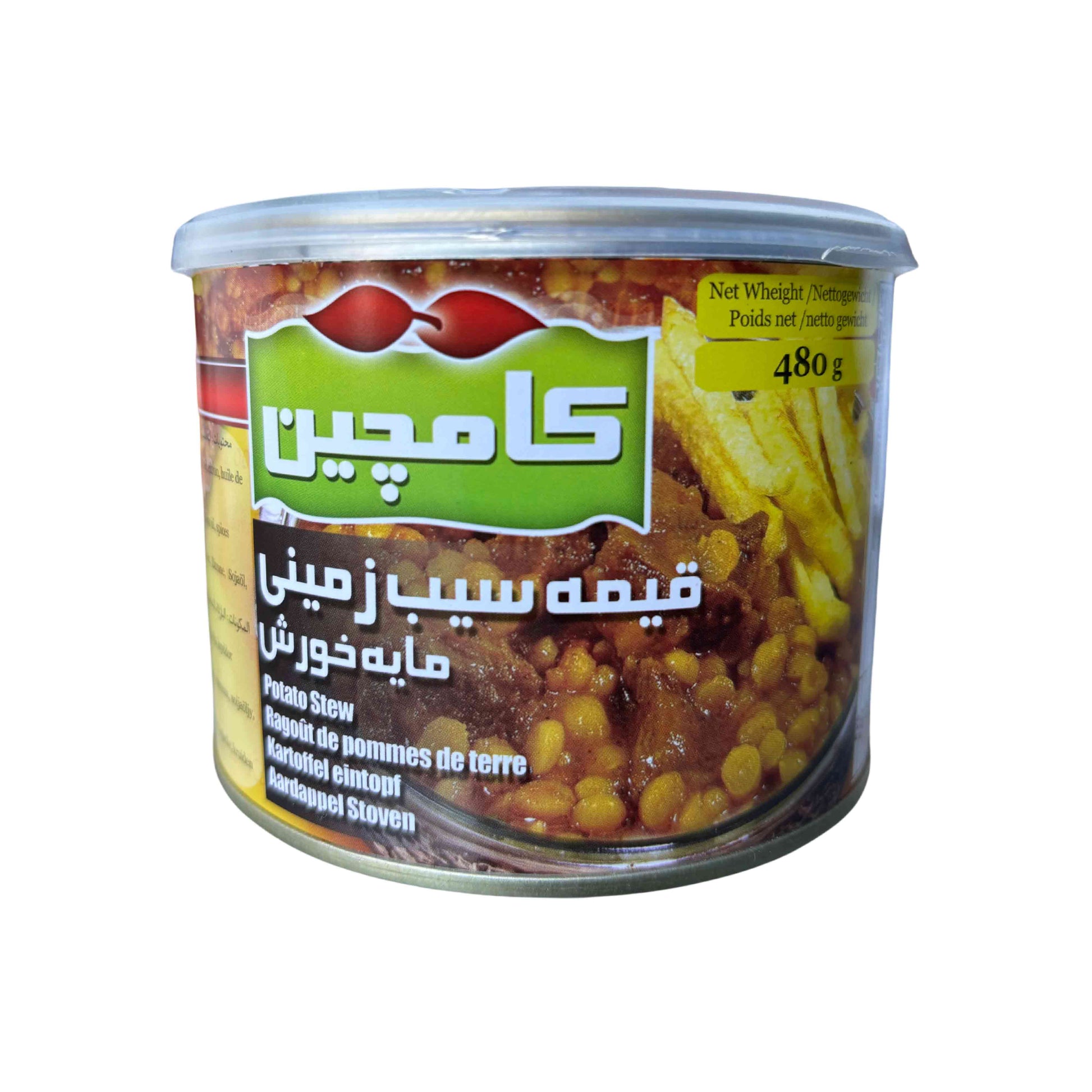 Der Kartoffeleintopf von Kamchin (Golvashe Food Industries, Iran) ist ein gebrauchsfertiges, herzhaftes Gericht mit Spalterbsen, Kartoffeln, Tomatenmark und Gewürzen. Ideal für eine schnelle, vegane Mahlzeit mit orientalischem Geschmack. Die Packung enthält 480g.