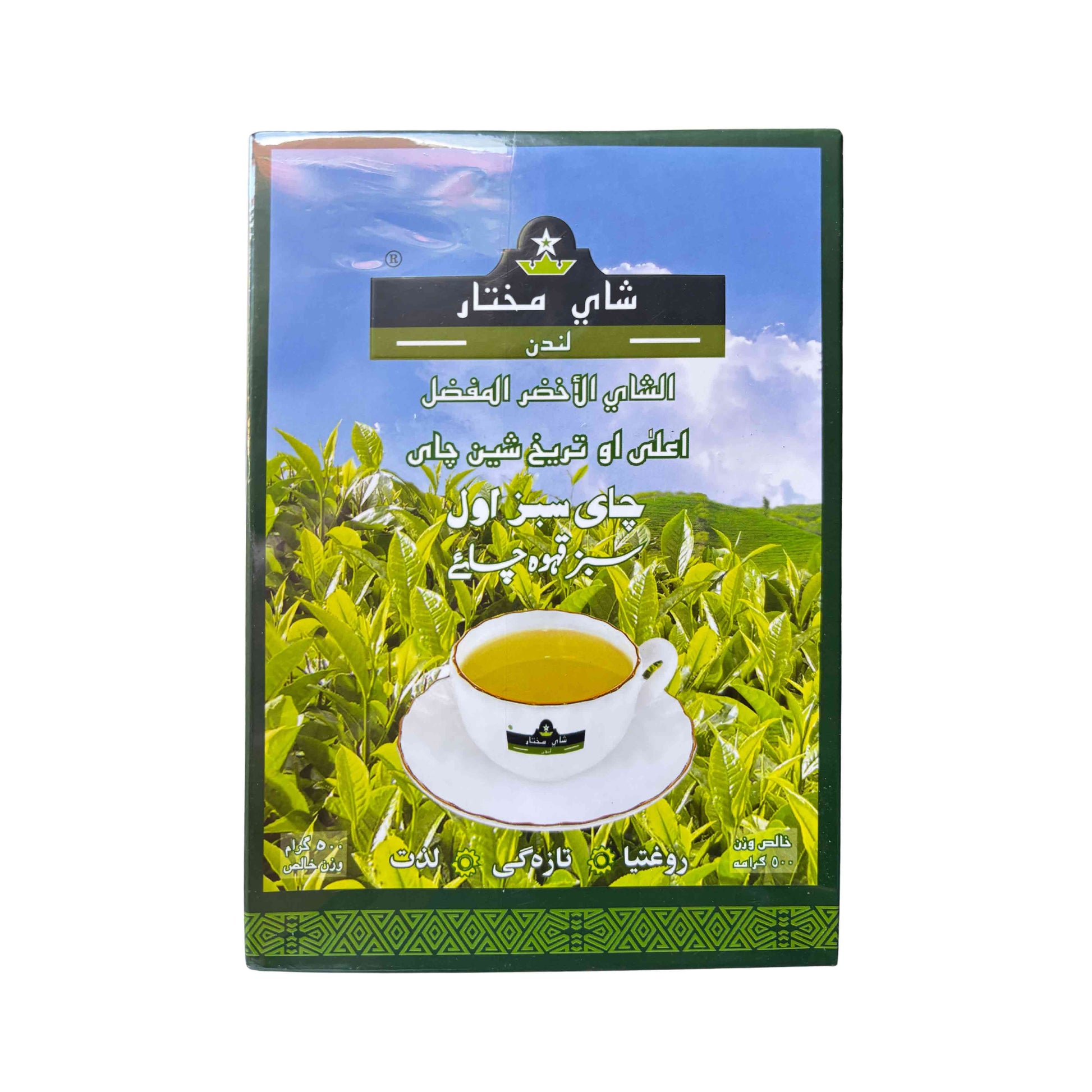 Shay Mokhtar London bietet eine exklusive Mischung feinsten grünen Tees an. Die Verpackung ist mehrsprachig (Arabisch, Persisch und Urdu) gestaltet und richtet sich an eine breite Zielgruppe im Nahen Osten und Südasien. Der Tee stammt aus hochwertigen Anbaugebieten und wird lose verpackt (500 g). Ideal für Teeliebhaber, die Wert auf Qualität und Frische legen.
