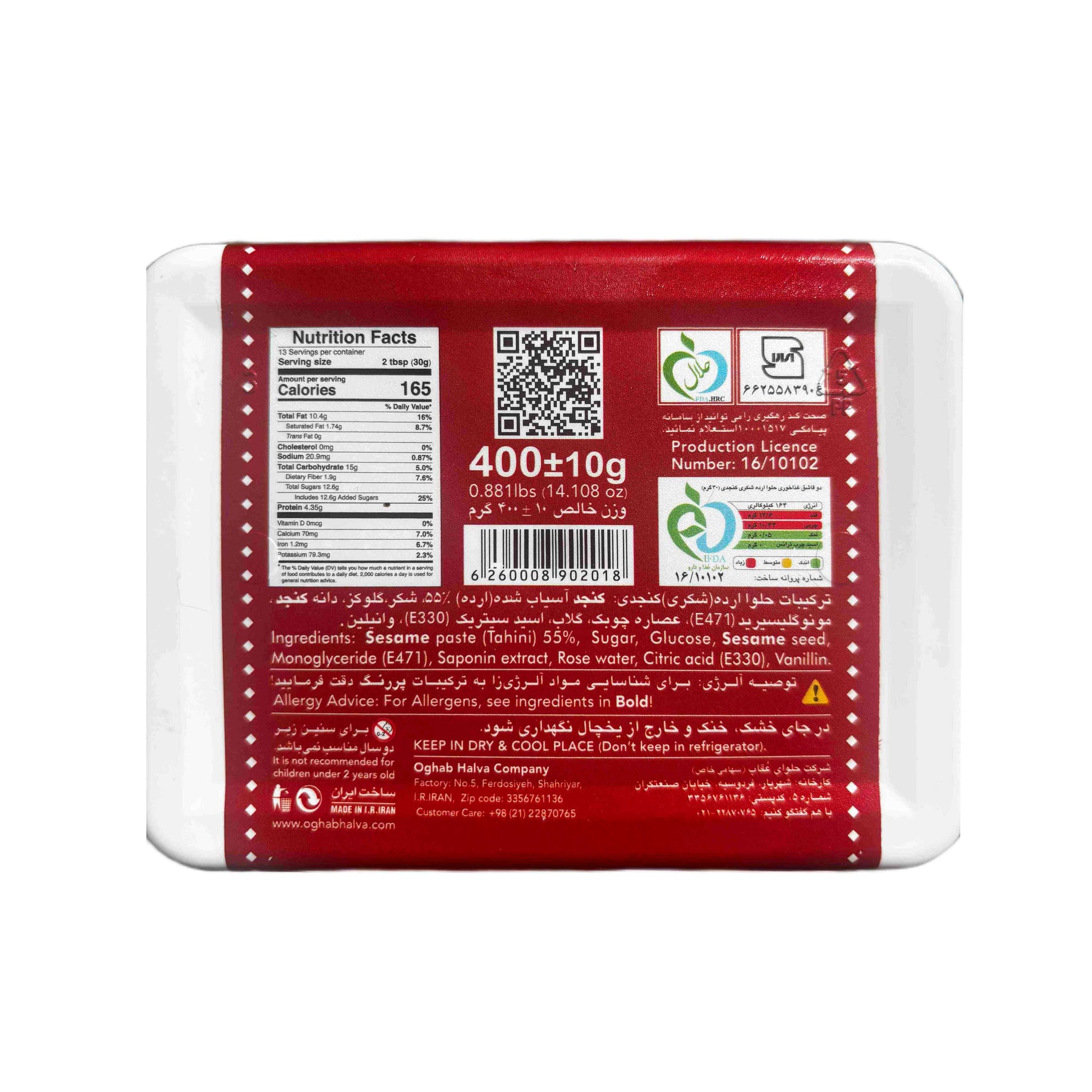 Dieses Halva (حلوا ارده) ist ein traditionelles persisches Sesamkonfekt, hergestellt von der bekannten Firma Oghab Halva Company in Shahriyar. Die Rezeptur basiert auf Tahini (Sesampaste), verfeinert mit Zucker, Glukose und Rosenwasser. Es ist ein natürlicher, pflanzlicher Energielieferant, besonders beliebt zum Frühstück. Die Packung enthält 400g.