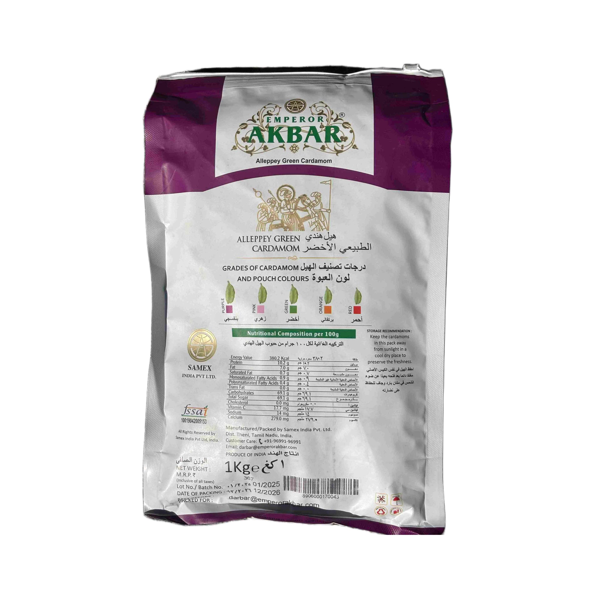Emperor Akbar Alleppey Green Cardamom ist ein hochwertiger, natürlicher grüner Kardamom aus Indien, speziell aus der Region Alleppey in Kerala – bekannt für ihre besonders aromatische und intensive Kardamomqualität. Die Kapseln werden sorgfältig ausgewählt, luftdicht verpackt und unterliegen einer Qualitätsklassifikation je nach Größe und Farbe (auf der Rückseite des Pakets dargestellt).