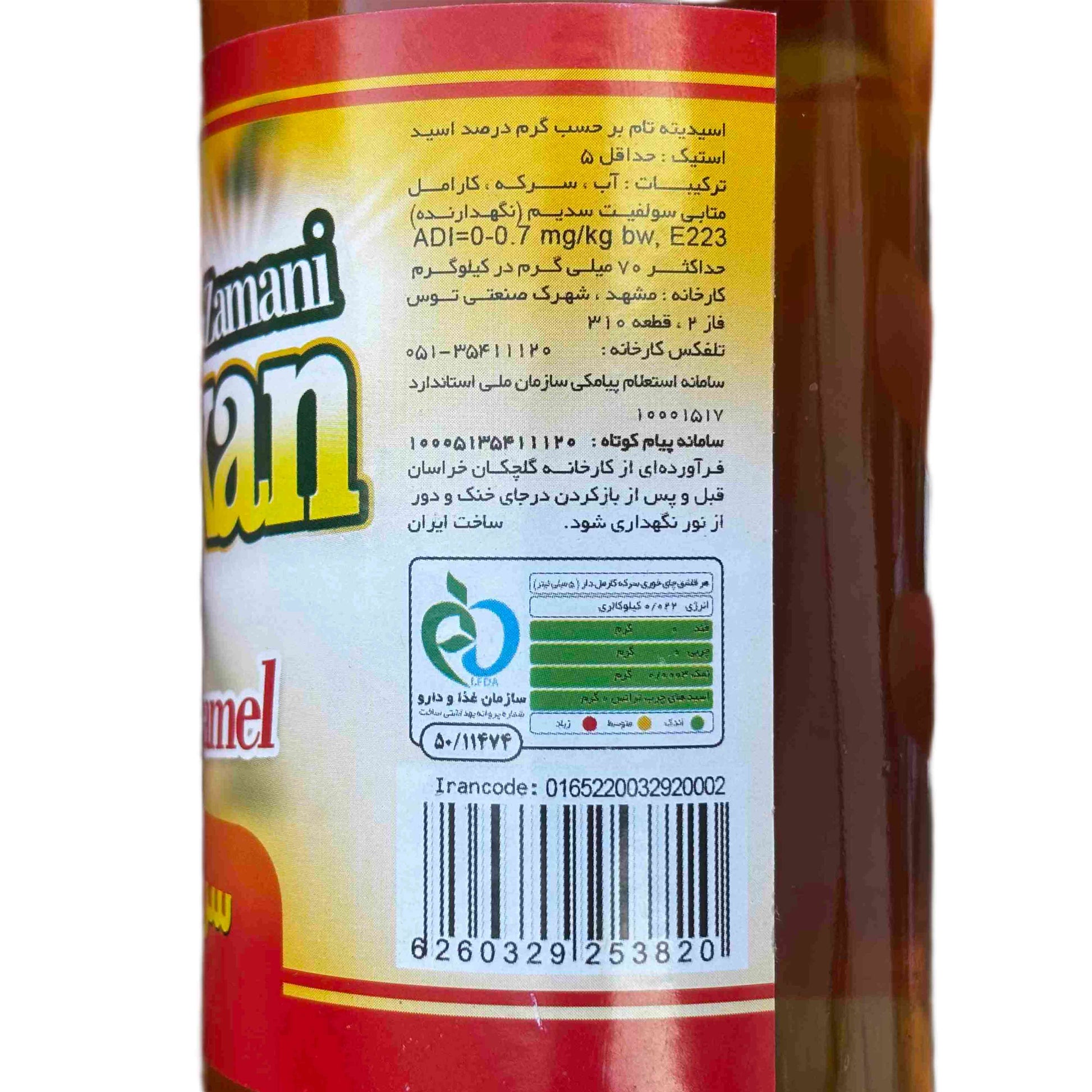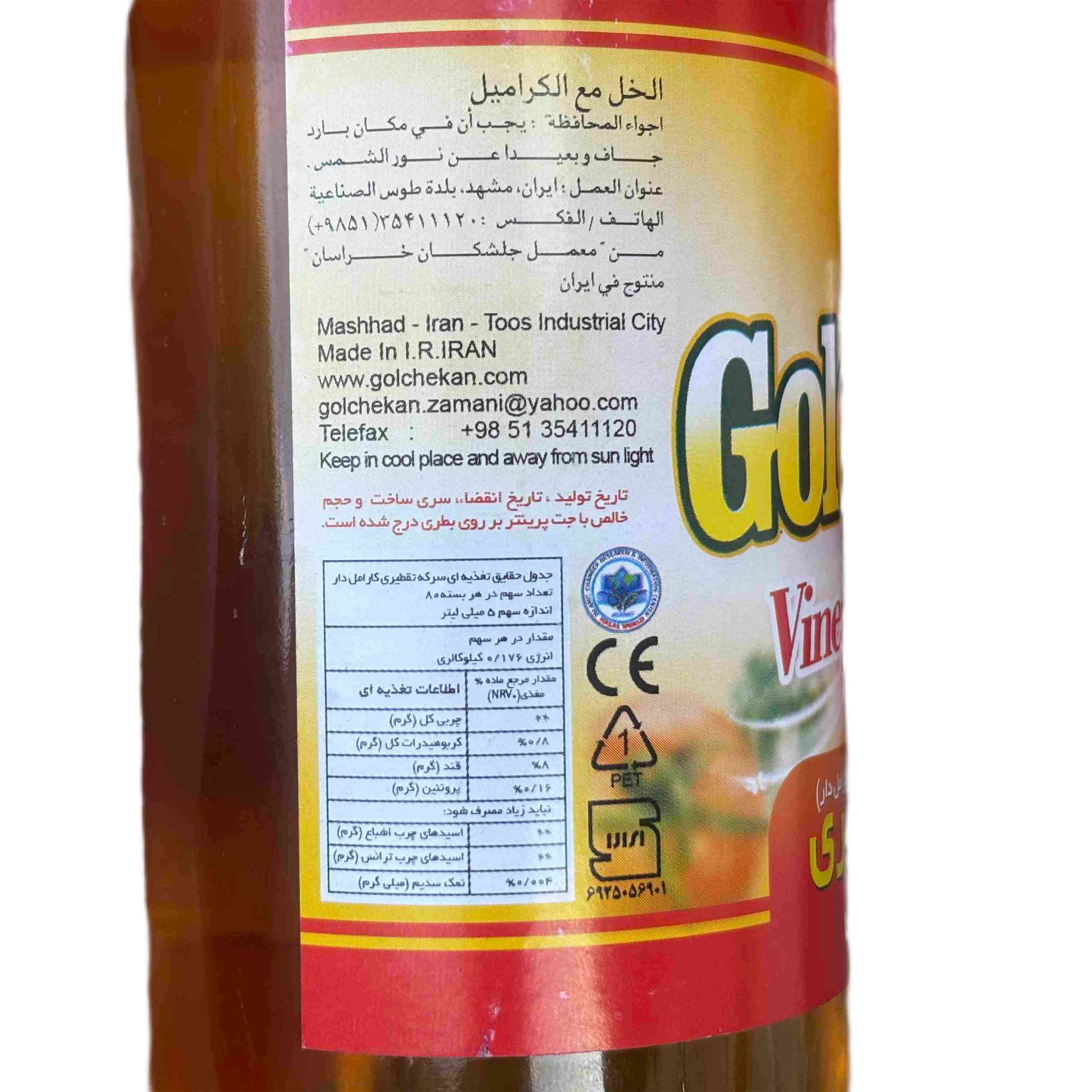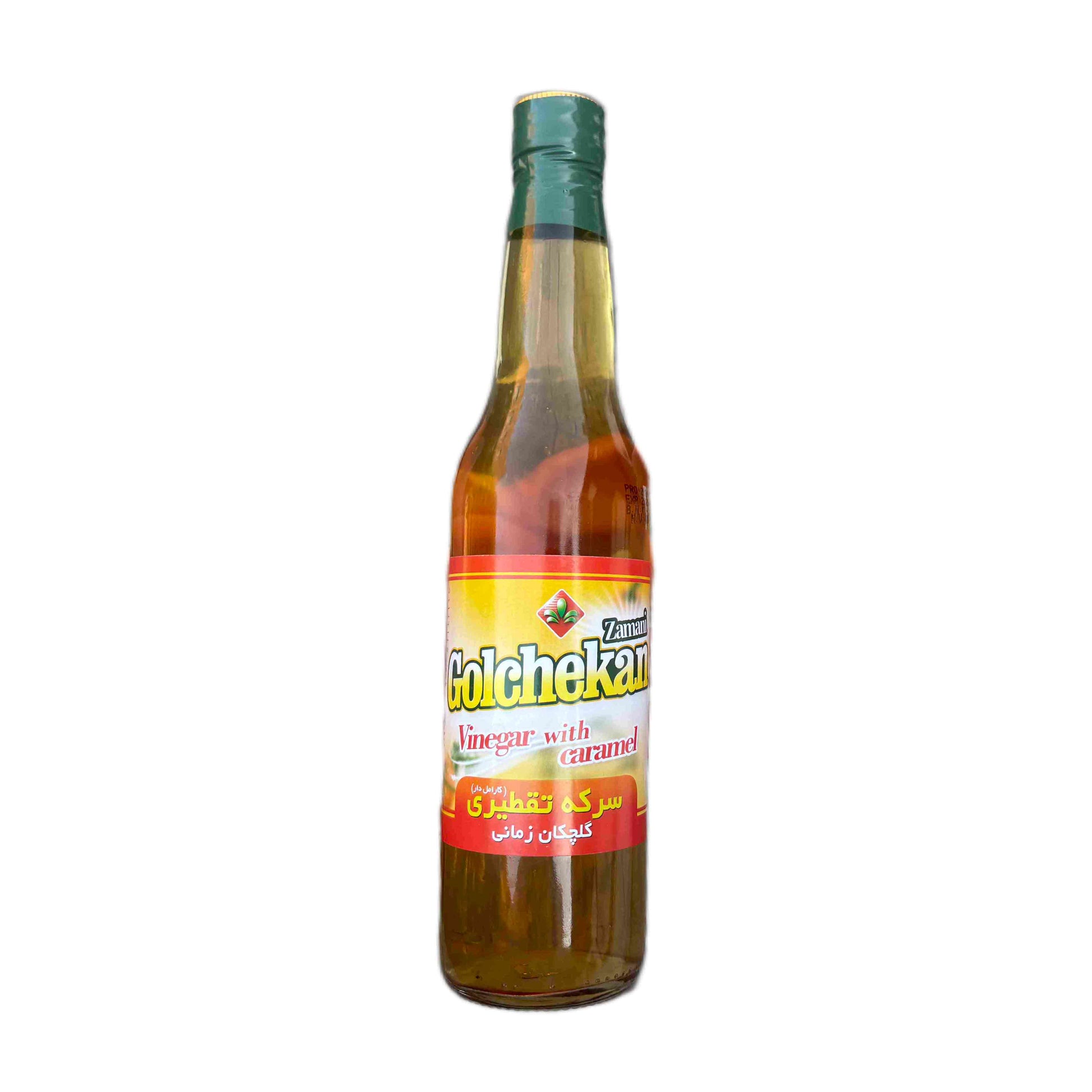 Dieser Destillat-Essig mit Karamell („Vinegar with caramel“) wird von Golchekan Zamani in Toos Industrial City, Mashhad, Iran hergestellt. Er entsteht durch die traditionelle Destillation von Weißweinessig, der anschließend mit Karamellfarbstoff (E150d) verfeinert wird. Die Packung enthält 400ml.