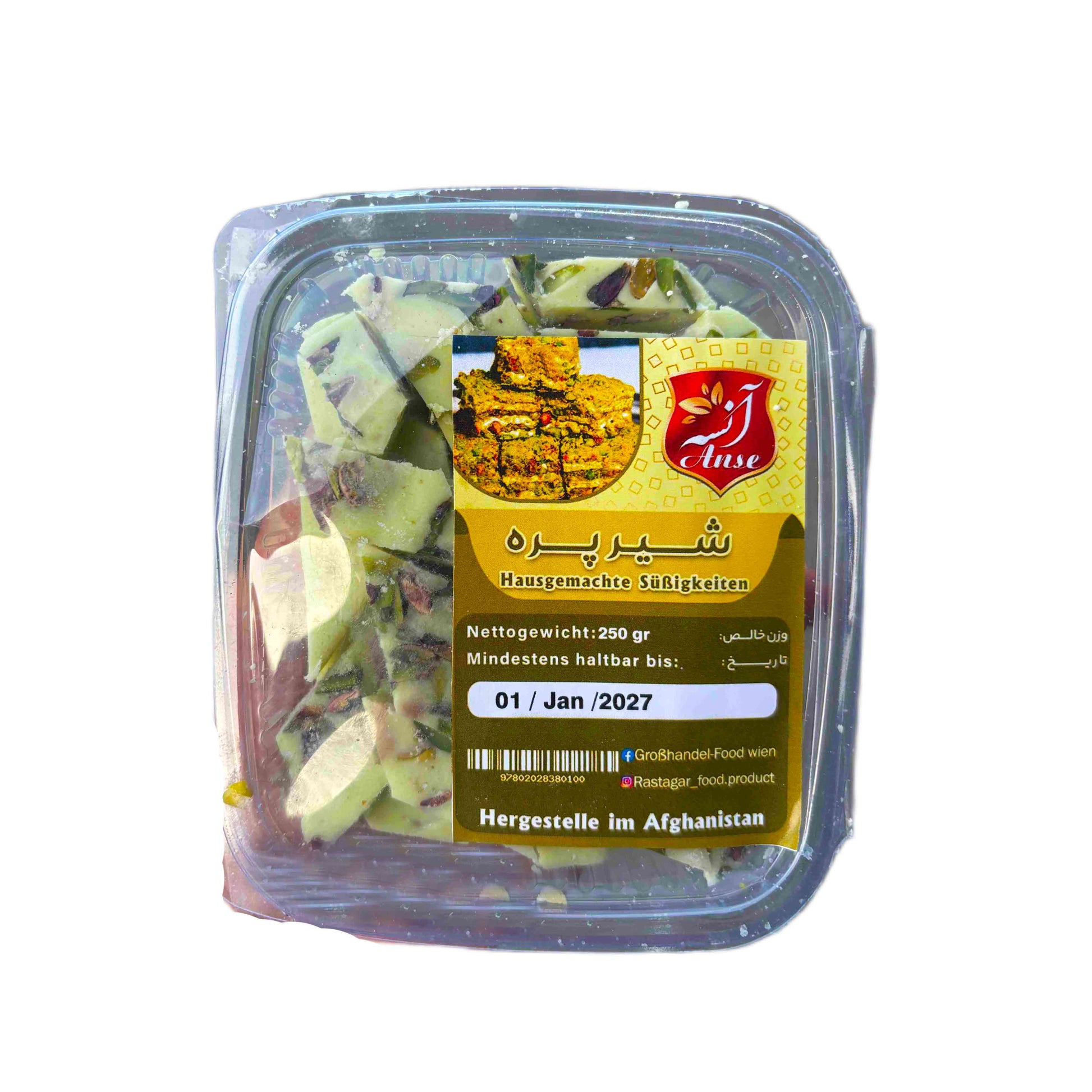Sheer Pera ist eine traditionelle afghanische Süßigkeit, die insbesondere zu Nowruz (Neujahrsfest), Hochzeiten und religiösen Feierlichkeiten serviert wird. Die Leckerei besteht aus einer süßen, schmelzenden Grundmasse auf Basis von Milchprodukten (z. B. Milchpulver, Sahne oder weißer Schokolade) und wird mit fein gemahlenen Nüssen wie Pistazien und Mandeln verfeinert.